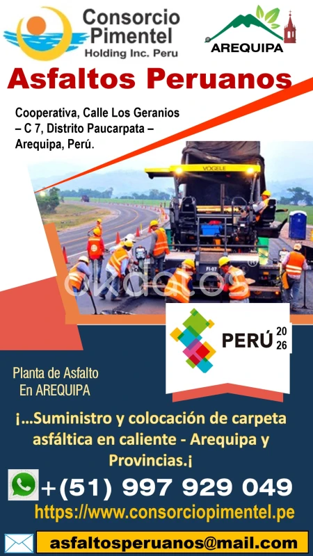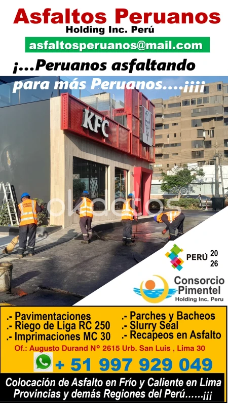 SUMINISTRO Y COLOCACION ASFALTO EN CALIENTE - LIMA, PROVINCIAS PERU 2026.- ASFALTOS PERUANOS, en este año 2026 que está casi iniciando, como empresa especializada en Fresado y Asfalto e Imprimaciones reiniciamos nuestras actividades a partir de Marzo del 2022 y nos dedicamos a mantener los mejores estándares de calidad requeridos en la construcción de caminos, canchas deportivas, estacionamientos, obras viales, bacheo y obras civiles en general. Identificamos los problemas en tu carpeta asfáltica y proponemos soluciones. Llevamos nuestra PLANTA DE ASFALTO MOVIL a provincias. Desde nuestros inicios, hemos ejecutado una gran variedad de trabajos relacionados con dicha especialidad en pavimentos asfálticos, tanto a la empresa privada como a organismos públicos, garantizando siempre una alta calidad en la ejecución de la misma y absoluta seriedad en el cumplimiento de los plazos pautados. Entre los servicios que ofrecemos destacan: FRESADO ASFALTADO Y PAVIMENTACIONES – LIMA 2026 a) Vialidad – Afirmado y Pavimentación de Urbanizaciones b) Estacionamientos de condominios c) Estacionamientos comerciales y Estaciones de Servicio. d) Estacionamiento de zona de carga e) Obras Civiles, Movimiento de Tierras y Alquiler de Maquinarias. IMPRIMACIÓN Costo x m2 = S/. 7.80 incluido IGV (a Diciembre 2026) Riego de Liga Costo x m2 = S/. 7.50 incluido IGV ASFALTADO EN CALIENTE 2" = S/. 57.50 incluido IGV (Consultar otros metrados) Fresado Asfalto Costo x m2 (Consultas metrado y Lugar de trabajo + Moviliz. Equipos) Contactarse con: Arq. Juan Fco. Yovera Cel. 997 929 049 (WhatsApp On Line) las 24 horas. Cel. +51 987 941 887 Email: asfaltosperuanos@mail.com Twitter: @consorciopiment http://www.consorciopimentel.pe Oficina Lima: Jr. Augusto Durand 2615, Urb. San Luis, Distrito de San Luis, Lima Base Chiclayo: Pedro Ruiz N° 1231, Of. 301, Chiclayo – Lambayeque Base Trujillo: Av. Nicolas de Piérola N° 1414 - Int. 301 - Trujillo (Altr. Ovalo Mochica - Costado de Emtrafesa). Base Arequipa: Coop. Calle Los Geranios C-7, Paucarpata, Arequipa Cel. +51 987 941 887 - Planta de Asfalto: Arequipa – Perú. Planta de Asfalto: Cajamarquilla, Lurigancho – Lima. ¡¡…Estamos presentes en cada pequeña y gran obra de construcción y asfaltado en el Perú 2026….¡¡¡¡¡