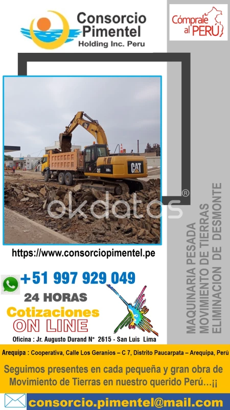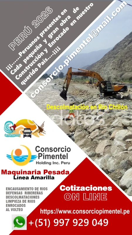 Descolmatación de Ríos Defensas Ribereñas Enrocado PERU 2026 – Obras de Emergencia. Somos una empresa general de obras y tecnología del río y mar. Nuestros trabajos de ingeniería y construcción de esta división de Suministro e Hincado de Pilotes, Tablestacas de Concreto Armado Prefabricados, Descolmatación de Ríos y Otros se emplean en proyectos de: Descolmatación de Ríos Estructuras Subterráneas y Enrocados. Contenciones y Entibados Estructuras Portuarias Obras y Defensas Ribereñas, Encausamiento, Enrocados. Pilotajes y Tablestacas Muros de Contención y Defensas Marítimas y Ribereñas. Movimiento de Tierras y Obras Civiles y Mineras en General. Iniciamos nuestras labores en Obras Ribereñas y Portuarias, hincado de pilotes y tablestacas con nuestra División en 2009, de la mano del Ing. Jorge A. Tejada Sara, orientando su trabajo al diseño, construcción, reparación, demolición e inspección submarina de obras portuarias y ribereñas, cimentaciones especiales y pilotaje en general, siendo una de las primeras empresas en el Perú en la realización de trabajos de Muelles utilizando equipos y maquinaria especializada y adecuada para éste tipo de trabajos. En éstos últimos 5 años hemos realizado trabajos de limpieza y descolmatación de ríos y colocación de rocas al volteo. Oficina Lima: Jr. Augusto Durand 2615, Urb. San Luis, Distrito de San Luis, Lima Base Chiclayo: Pedro Ruiz N° 1231, Of. 301, Chiclayo – Lambayeque Base Trujillo: Av. Nicolas de Piérola N° 1414 - Int. 301 - Trujillo (Altr. Ovalo Mochica - Costado de Emtrafesa). Base Arequipa: Coop. Calle Los Geranios C-7, Paucarpata, Arequipa Cel. +51 987 941 887 - Planta de Asfalto: Arequipa – Perú Cel. +51 997 929 049 (WhatsApp On Line) Contacto: Arq. Juan Fco. Yovera – Celular +51 987 941 887 (atención 24 horas) Email: consorcio.pimentel@mail.com obrasportuarias2021@gmail.com http://www.consorciopimentel.pe twitter: @consorciopiment Visite Nuestro Facebook : Consorcio Pimentel https://www.youtube.com/watch?v=s-7x_X6dO9o RUC Nº 10405240713 - Luis Alfredo Yafac Liza (*) Integrante del Consorcio Pimentel Holding Inc. Perú