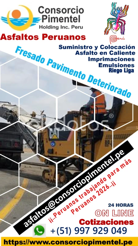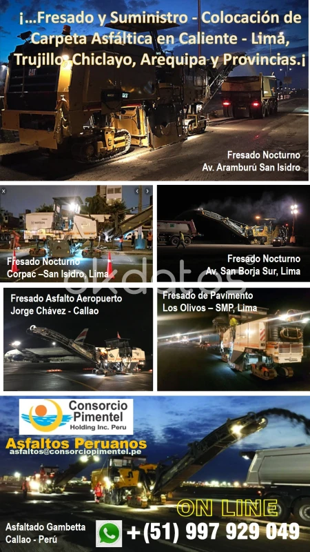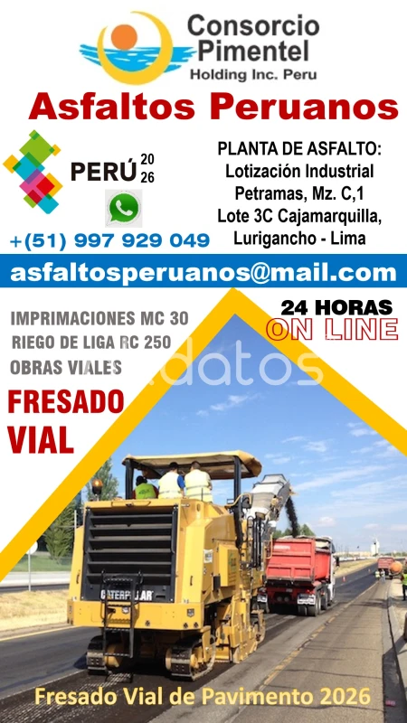 Fresado de Asfalto Precio por m2 – Asfaltado Perú 2026 ASFALTOS PERUANOS, en éste año 2025 que está transcurriendo y luego del éxito de la APEC 2024, como empresa especializada en Fresado y Asfalto e Imprimaciones reiniciamos nuestras actividades a partir de Enero del 2026 y nos dedicamos a mantener los mejores estándares de calidad requeridos en la construcción de caminos, canchas deportivas, estacionamientos, obras viales, bacheo y obras civiles en general. Identificamos los problemas en tu carpeta asfáltica y proponemos soluciones y realizando trabajos de Fresado de Pavimento y Posterior Riego con Emulsión Asfáltica y Asfaltado. Desde nuestros inicios, hemos ejecutado una gran variedad de trabajos relacionados con dicha especialidad en pavimentos asfálticos, tanto a la empresa privada como a organismos públicos, garantizando siempre una alta calidad en la ejecución de la misma y absoluta seriedad en el cumplimiento de los plazos pautados. Entre los servicios que ofrecemos destacan: FRESADO ASFALTADO Y PAVIMENTACIONES – LIMA y PROVINCIAS 2026 a)Vialidad – Afirmado y Pavimentación de Urbanizaciones b) Estacionamientos de condominios c) Estacionamientos comerciales y Estaciones de Servicio. d) Estacionamiento de zona de carga c) Carreteras, Mantenimiento Vial y Conservación d) Obras Civiles, Movimiento de Tierras y Alquiler de Maquinarias. Fresado Asfalto Costo x m2 (Consultas metrado y Lugar de trabajo + Moviliz. Equipos) Contactarse con: Arq. Juan Fco. Yovera Cel.+51 997 929 049 (WhatsApp On Line) las 24 horas. Email: asfaltosperuanos@mail.com Twitter: @consorciopiment http://www.consorciopimentel.pe Oficina Lima: Jr. Augusto Durand 2615, Urb. San Luis, Distrito de San Luis, Lima Base Chiclayo: Pedro Ruiz N° 1231, Of. 301, Chiclayo – Lambayeque Base Trujillo: Av. Nicolas de Piérola N° 1414 - Int. 301 - Trujillo (Altr. Ovalo Mochica - Costado de Emtrafesa). Base Arequipa: Coop. Calle Los Geranios C-7, Paucarpata, Arequipa Cel. +51 987 941 887 - Planta de Asfalto: Arequipa – Perú Planta de Asfalto: Cajamarquilla, Lurigancho – Lima. ¡¡…Estamos presentes en cada pequeña y gran obra de construcción y asfaltado en el Perú 2026….¡¡¡¡¡ RUC Nº 10405240713 - Luis Alfredo Yafac Liza (*) Integrante del Consorcio Pimentel Holding Inc. Perú
