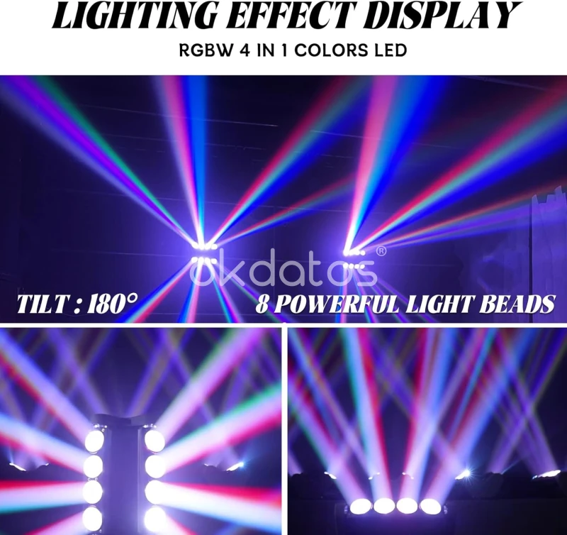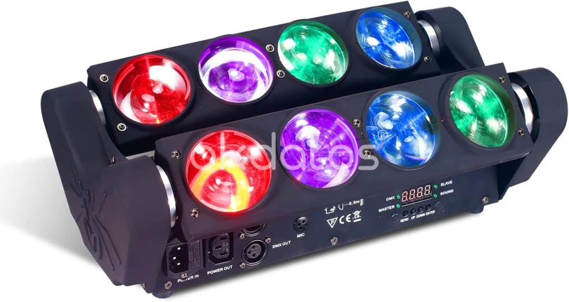 Efecto tipo spider de alto impacto visual con 8 LEDs de 15W RGBW, ideal para escenarios, conciertos, DJs y eventos de alto dinamismo. Sus brazos móviles generan barridos rápidos, haces abiertos y efectos envolventes que llenan el espacio con color y movimiento. Perfecto para música electrónica, rock y shows en vivo donde se busca energía y presencia escénica.