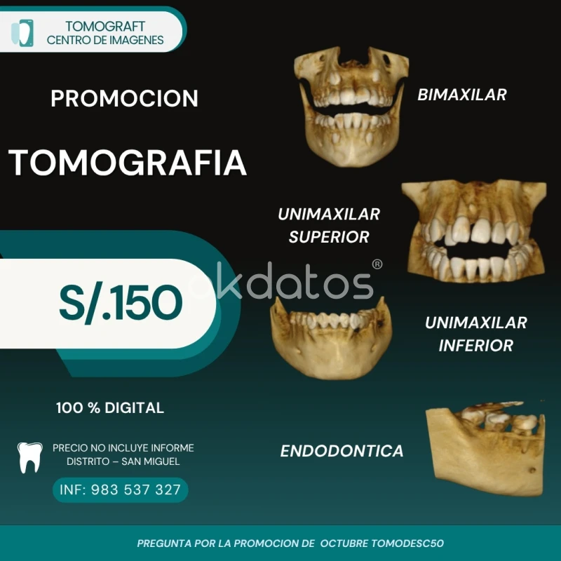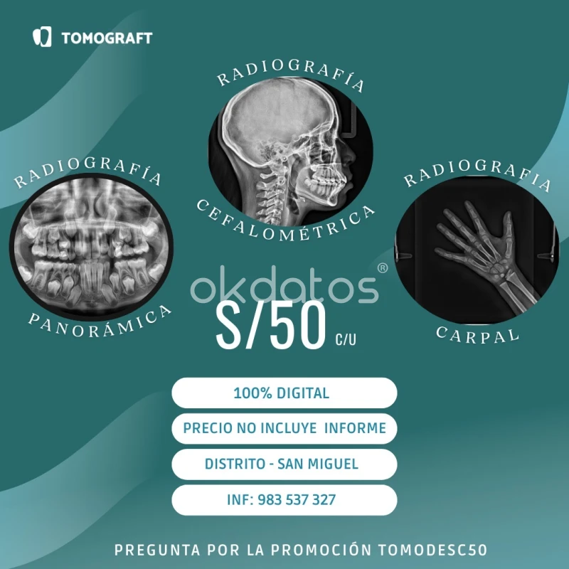 Somos Tomograf/ centro de imágenes dentales. Por el mes de octubre estamos de promoción en radiografías dentales como: -PANORAMICA -CEFALOMETRICA -CARPAL a s/. 50.00 c/u - encuéntranos en el distrito de San Miguel . A espalda del británico de la av la marina