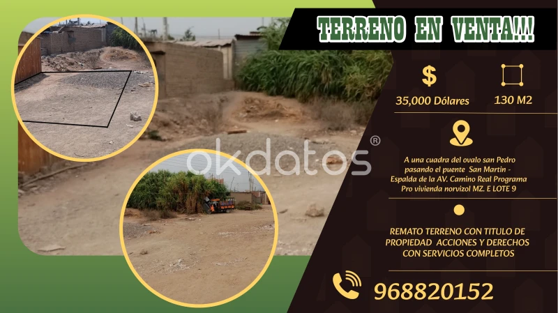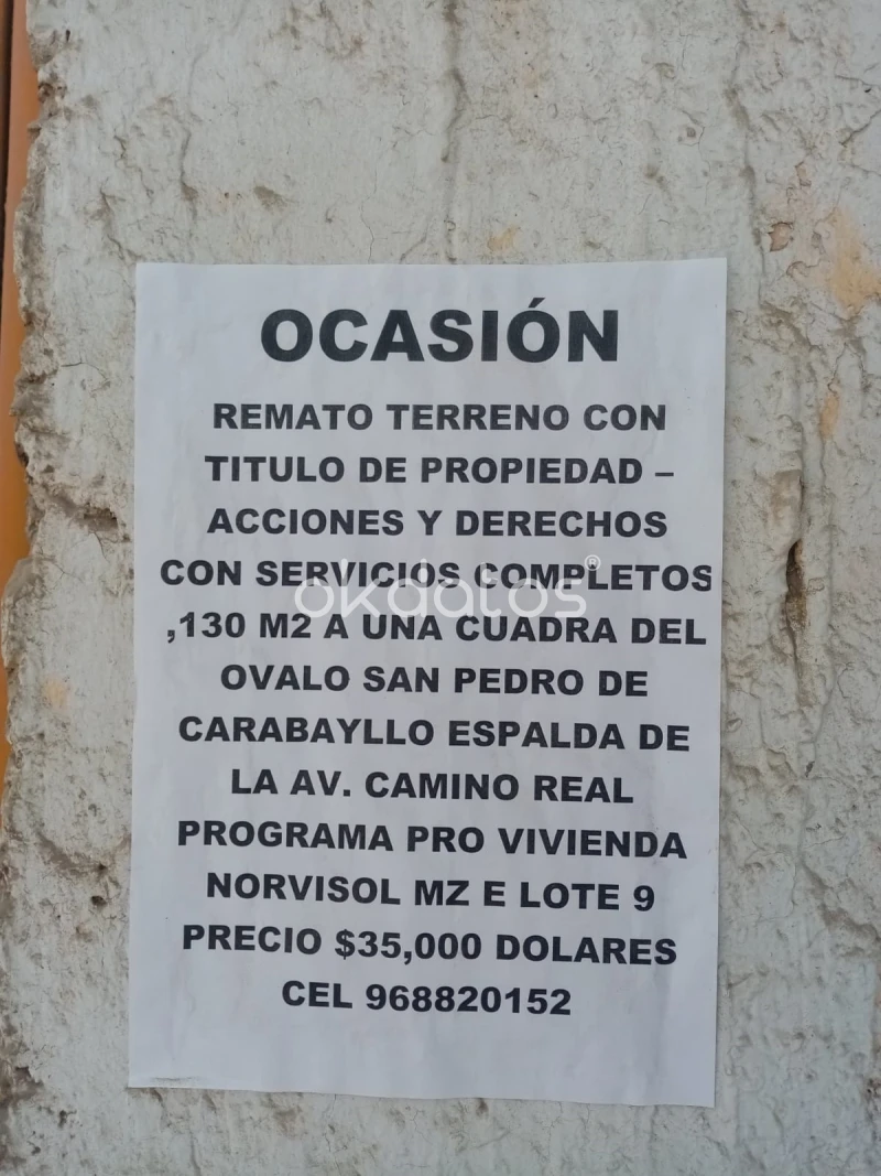 Terreno en Venta Remato Terreno Con Titulo De Propiedad Acciones Y Derechos Con Servicios Completos - En Carabayllo US$35.000 130 m² totales Características del inmueble Superficie total 130 m² REMATO TERRENO CON TITULO DE PROPIEDAD ACCIONES Y DERECHOS CON SERVICIOS COMPLETOS - EN CARABAYLLO A UNA CUADRA DEL OVALO SAN PEDRO ESPALDA DE LA AV. CAMINO REAL 35,000 DOLARES TELF: 968820152