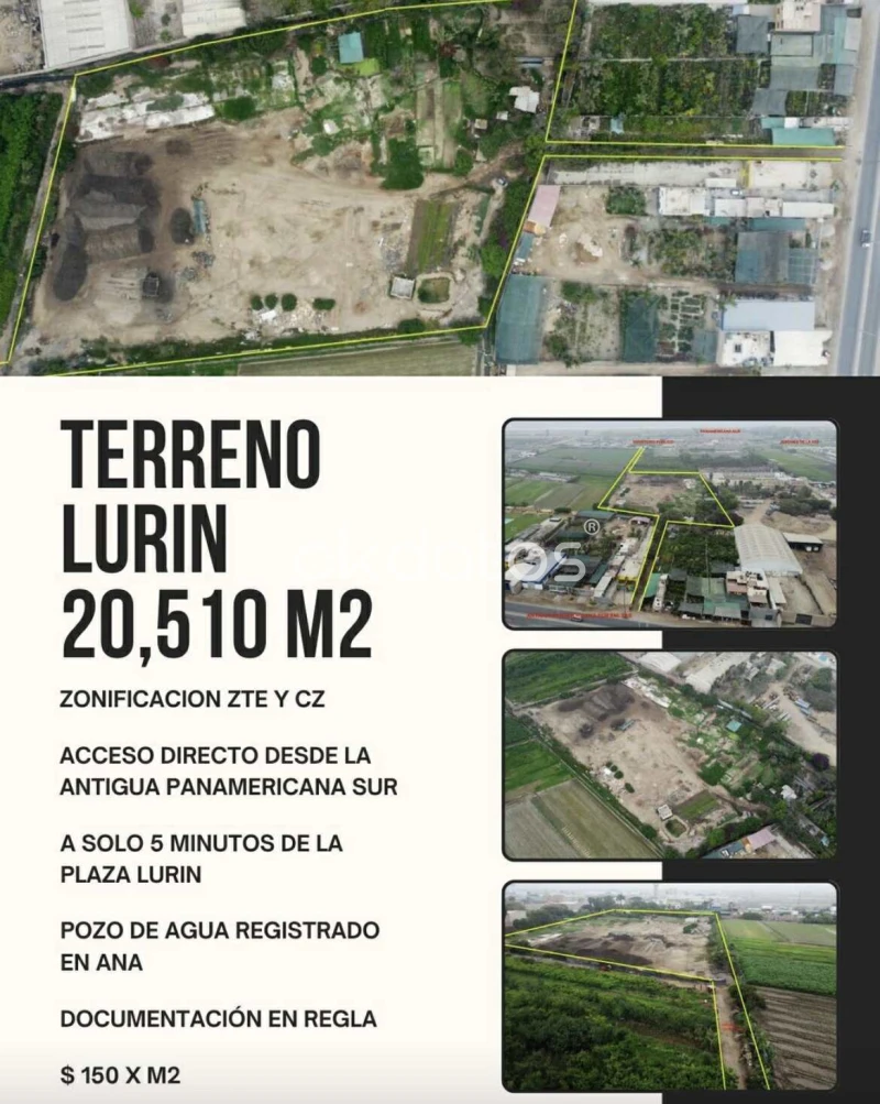 Precio en dólares $$ Se vende terreno en Lurin de 20,510m2 con entrada privada tipo sendero privado. Ubicado en antigua panamericana sur, frente a grifo, zona comercial con auge de gran crecimiento, fábricas diversos negocios:bancos, tiendas,farmacias restaurantes ,granja,a 4 minutos de plaza de Lurin y centro comercial y más . 2 entradas Entrada privada por antigua carretera pan su, y por nueva pan sur Precio de : 150$ dólar m2 Áreatotal 20,510m2 Zonificación CZ y ZTE Pozo de agua -ANA- Se muestra la propiedad previa cita y coordinación -Visita guiada - Papeles en regla listo para trasferencia notarial