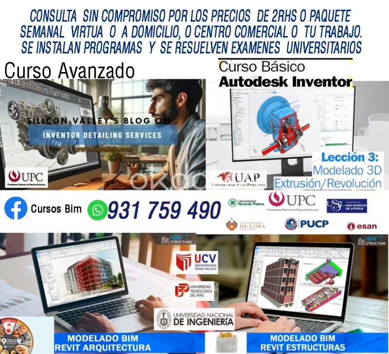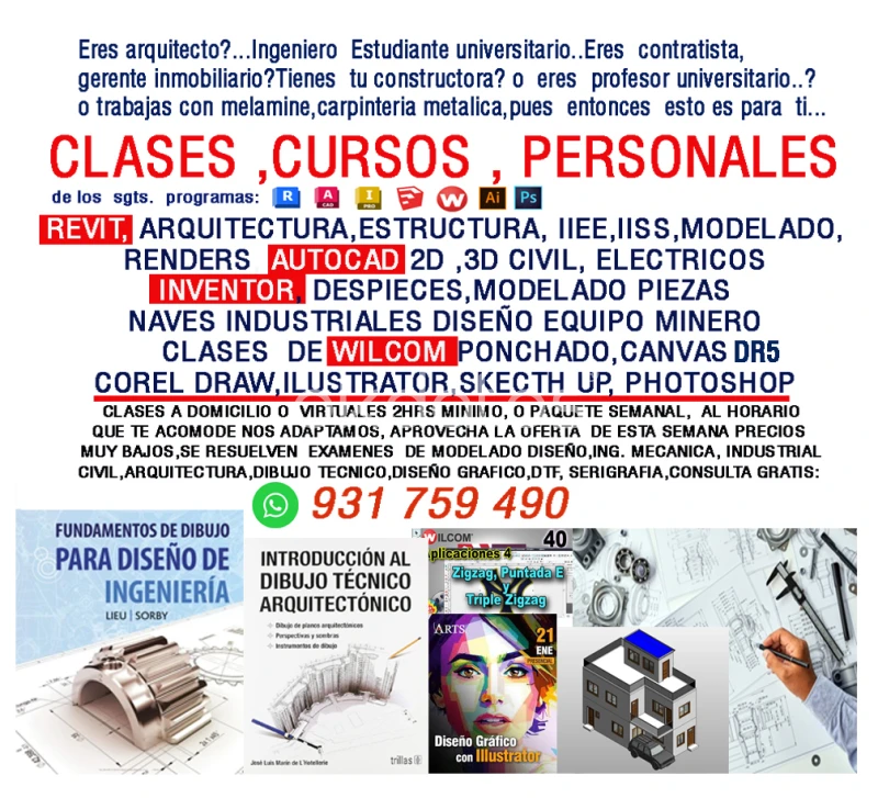 |SE DICTAN CLASES PERSONALIZADAS 2 HRS MINIMO. O PQTE DE UNA SEMANA CURSOS DE ARQUITECTURA, INGENIERIA DISEÑO INDUSTRIAL, DISEÑO GRAFICO PRENSA, SERIGRAFIA, ETC. REVIT AUTOCAD TEKLA INVENTOR PHOTOSHOP, COREL, WILCOM DR5, ENSCAPE, RENDERS. MAS GRATIS PDF,MANUAL LIBRERIAS, BIBLIOTECAS MEGAS. PRACTICA 100 % CONSULTA AL NUMERO WASAP GRATIS SE RESUELVEN EXAMENES DE DIBUJO , MODELADO 3D, METRADOS , CUANTIFICACION EN ARQUITECTURA, INGENIERIA MECANICA , INDUSTRIAL. CLASES UNIVERSITARIAS. SE DAN SERVICIOS PROFECIONALES