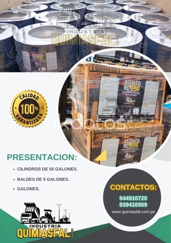 "INDUSTRIA PERUANA QUIMIASFAL" ASFALTOS RC-250(EN FRIO Y CALIENTE) EMULSIONES ASFALTICAS CSS-1H CSS-2H BUEN PRECIO BREA LIQUIDA INDUSTRIAL EN CILINDROS DE 55 GLNS ALQUITRAN IMPERMEABILIZANTE CEMENTO ASFALTICO PURO BREA DURA EN BLOQUES CUADRADOS Y CIRCULARES DE 15,25 KLS PINTURAS ASFALTICAS PINTURAS DE TRÁFICO ASFALTO MC-70, RC-500 MEMBRANA O MANTO ASFALTICO PURO ENTRE OTROS ENVIOS A TODO EL PERÚ