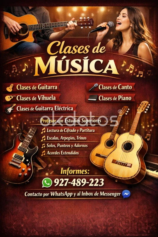 馃幎 Clases de Guitarra y Canto Para ni帽os, j贸venes y adultos. 馃帳 Canto: t茅cnica vocal por edades, respiraci贸n, proyecci贸n, afinaci贸n, lectura de partitura, solfeo y r铆tmica. 馃幐 Guitarra (popular y el茅ctrica): primera guitarra, solos y requinto, acompa帽amientos,, vals, rock, salsa; lectura de partitura, cifrado, tablatura; escalas, arpegios, etc.. 馃挜 Din谩mica moderna, pr谩ctica y motivadora. info 927-489-223 https://www.superprof.pe/ir/33386675-ced98c