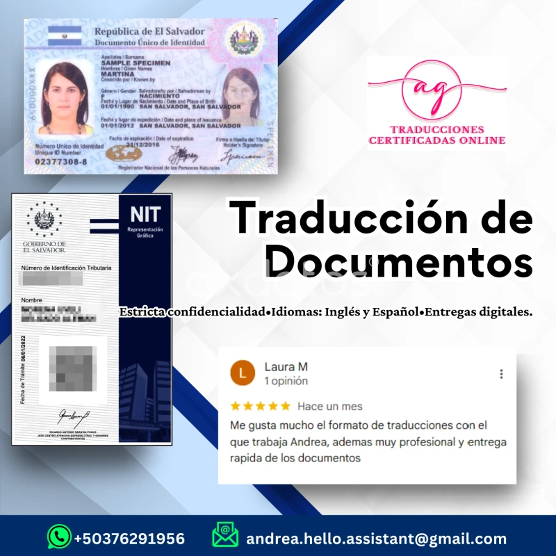 Inglés<>Español. Precios desde $7. Todo El Salvador sin salir de tu casa. Trabajos de alta calidad. No se arriesgue mostrando sus documentos personales. Traducciones incluyen certificación y sello de traductora. Actas de nacimiento, matrimonio, DUI, NIT, testimonios, formularios, antecedentes, COPART, académicos, solvencias, facturas, VMT, etc.