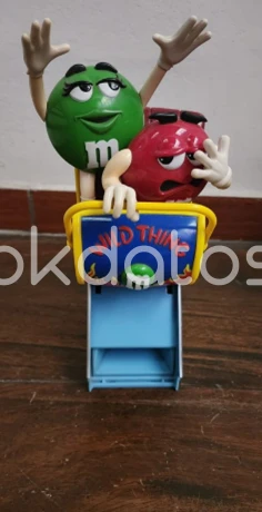 Figura dispensadora de dulces con personajes de M&M’s (verde y rojo) montados en una montaña rusa que dice “Wild Thing”.