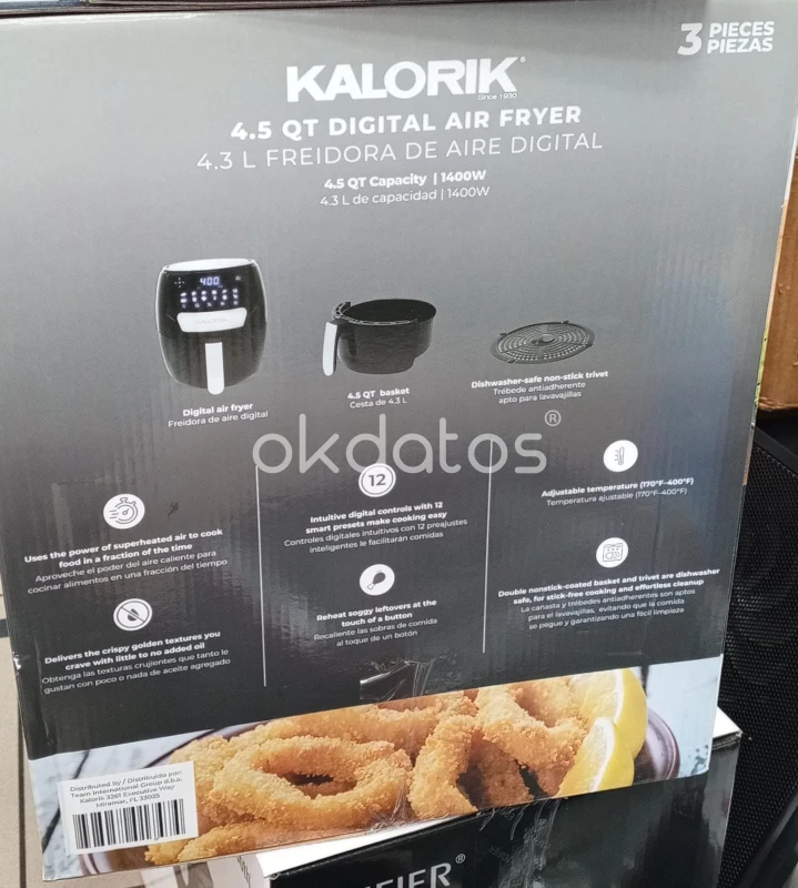 Freidora de Aire Digital KALORIK 4.3 Litros (San Salvador) Precio: $45.00 c/u Marca: Kalorik Capacidad: 4,3 LItros Color: Negro Dimensiones: 27,41 cm×38,20 cm×32,1 cm Cesta doble recubierta antiadherente. Apto para lavavajillas. Cocina sin palo y limpieza sin esfuerzo. Tiempo ajustable (60 minutos con apagado automático). Temperatura (170°F–400°F). Controles digitales intuitivos con 13 presets inteligentes. Utiliza la potencia del aire sobrecalentado para cocinar la comida en una fracción del tiempo. Ofrece las texturas doradas y crujientes que anhelas con poco o ningún aceite añadido. Garantía: 1 mes Lugar de entrega: Mi Tienda SV, Paseo General Escalón en Centro Comercial Fuentes de Bethoven Local #3 San Salvador. Si necesita que se lo envié tiene un costo extra de $3.00 en el área de San Salvador. Fuera de San Salvador favor de consultar.