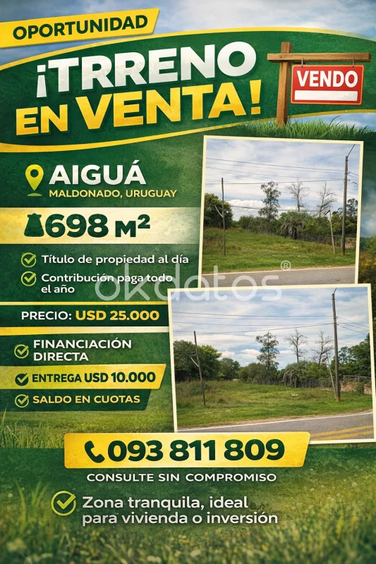 🏡 TERRENO EN VENTA – Aiguá 📐 698 m² 📄 Título de propiedad al día 💵 Contribución paga todo el año 💰 Precio: USD 25.000 ✅ Financiación directa: Entrega USD 10.000 Saldo en cuotas 📍 Zona tranquila, ideal para vivienda o inversión 📲 Contacto: 093 811 809