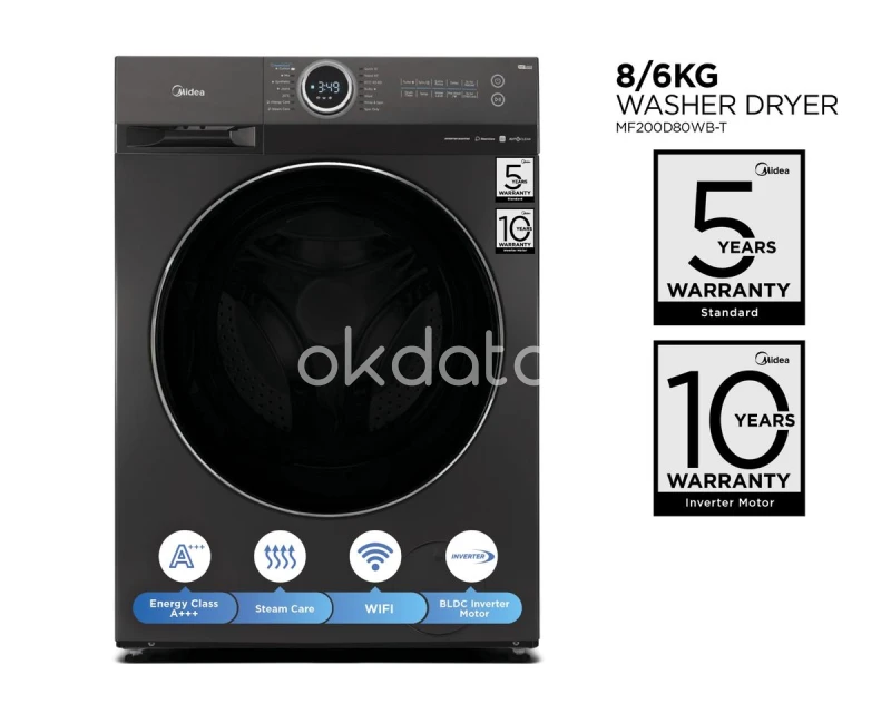 Upgrade your home with the Midea MF200D80WB-T - a perfect blend of innovation, energy-efficiency, and modern functionality. Designed for South African households, this premium washer dryer combo delivers outstanding wash and dry results while saving time, space, and electricity. Key Features 8kg Washing / 6kg Drying Capacity - Ideal for daily use in medium-sized homes. Inverter Heat Pump Drying - Energy-efficient drying that's gentle on fabrics. SmartHome Wi-Fi Control - Manage laundry cycles remotely with the Midea app. Turbo Wash Function - Reduces wash time by up to 14% for quicker cleaning. SteamCare Function - Refreshes clothing while removing allergens and odours. Auto Drum Clean & AirFresh - Keeps your machine hygienic and smelling fresh. Child Lock & Delay Start - Safety and flexibility for busy households. Energy Class A Efficiency - Helps reduce electricity costs without compromising performance. Specifications Model Code: MF200D80WB-T Capacity: 8kg wash / 6kg dry Power Output: 1900W (Wash), 1300W (Dry) Control Type: Digital Touch Panel with Display Voltage/Frequency: 220-240V ~ 50Hz Colour: Titanium Additional Functions: SteamCare, Turbo Wash, Smart Wi-Fi, Delay Start, Auto Drum Clean, Child Lock, AirFresh Dimensions Product Dimensions: 595 × 475 × 850 mm Packing Dimensions: 655 x 560 x 885 mm Net Weight: 65 kg Gross Weight: 68 kg Midea - Inspired by Life Midea is one of the world's leading appliance manufacturers, providing smart, sustainable solutions that improve daily living. Trusted globally and designed for modern lifestyles, Midea products combine innovation, efficiency, and reliability. Care Instructions Wipe exterior with a soft damp cloth after each use. Clean the detergent drawer, lint filter, and drum regularly. Use the "Auto Drum Clean" function every month. Leave the door open between washes to prevent moisture buildup. Refer to the user manual for full maintenance guidance. Why Buy This Model? Whether you're upgrading to save space or enhance efficiency, the Midea 8/6 washer dryer offers unmatched value and functionality in a compact form. With intelligent drying, steam refresh, and remote control features, it's built for today's smart homes. Add to your cart today and enjoy next-level laundry convenience - delivered fast, with trusted local sj Warranty: 10 Years o x 8/6 F