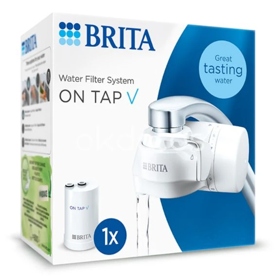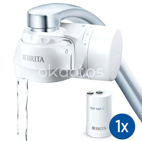 The plug-in water filter for water that tastes just right! An optimal solution to your drinking water needs - the ON TAP V water filter system. With just a simple plug to most threaded taps, you can now enjoy great-tasting water directly from your kitchen tap, without the need to carry heavy water bottles. Our advanced 4-step filtration system ensures that even small particles are retained, while reducing chlorine and other odor and taste-impairing substances such as lead and copper. You'll enjoy a natural, fresh taste that is ideal for drinking or cooking. With three convenient modes to choose from, including filtered water (cold), tap water and a shower mode (unfiltered water), you'll have everything you need for your daily kitchen tasks. Installation is easy and with 5 adaptors included, the ON TAP V system is compatible with most standard taps.x Plus, you can easily replace the cartridge without any tools - just unscrew, pull out the old one and replace it with the new filter. Say goodbye to plastic bottles and enjoy always available fresh water at a fraction of the cost of bottled water. And with a manual calendar indicator, you'll always know when it's time to replace the filter, giving you peace of mind for months to come. xAlthough this BRITA On Tap System comes with 5 adaptors for most common tap styles, these adaptors will not fit some specialised tap styles. Please refer to the imagery for more details on which types of taps these adaptors will not fit. To determine if this BRITA On Tap system is suitable for your tap, please refer to the below adaptor fitting types that are included with this system: 1 x adaptor for 22mm Metric female thread 1 x adaptor for 22mm Whitworth female thread 1 x adaptor for 23mm Whitworth male thread 1 x adaptor for 24mm Metric male thread 1 x universal adaptor for tap diameter between 15 - 25mm Be part of the change. Because every plastic bottle counts! With every BRITA product, you are actively helping to reduce the number of plastic bottles that could end up in waste. The carbon footprint of BRITA filtered water is already up to 25x smaller than for bottled water. But we are constantly working on making it even smaller. And among other things, we believe that the shift to using more sustainable materials in our products, like bio-based plastics, plays a critical role in reducing our dependency on fossil fuels helps to reduce carbon emissions. BRITA provides sustainable drinking water solutions and is the world's No. 1 for drinking water filters. German Quality Design - since 1966 What's in the box 1 x On Tap V system 1 x On Tap V Cartridge