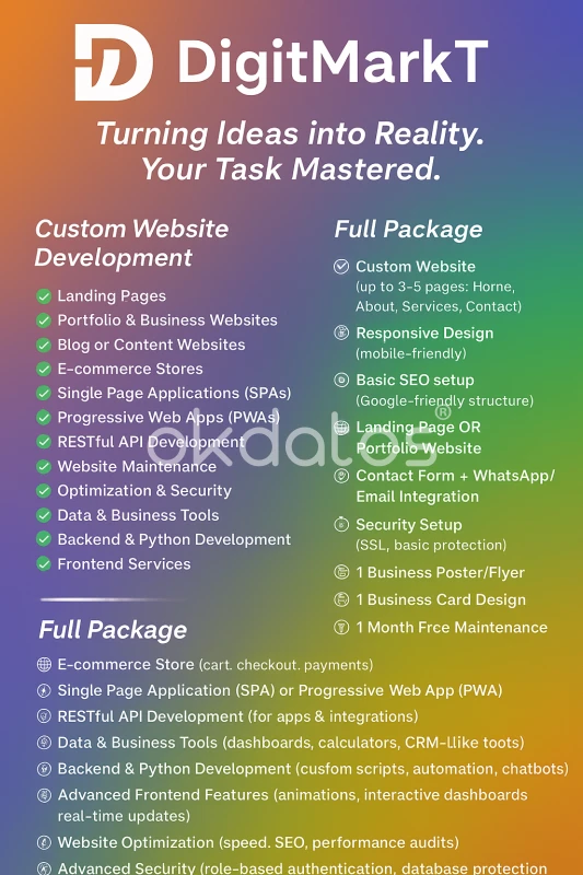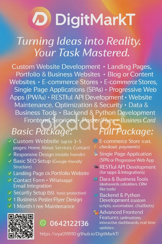 🚀 DigitMarkT – Transforming Ideas into Reality! We specialize in creating professional websites, custom apps, and digital solutions using HTML, CSS, JavaScript, and Python. ✨ Why DigitMarkT? Modern, creative, and mobile-friendly designs Secure and scalable web & app solutions Personalized support and guidance Fast and reliable service 📲 Contact us: WhatsApp: 064 212 2136 Email: siyabongathomo.tpy@gmail.com 🌐 Website: https://siya019910.github.io/DigitMarkT-second/