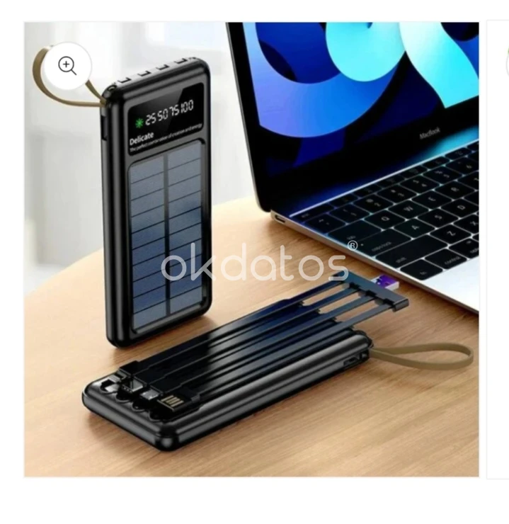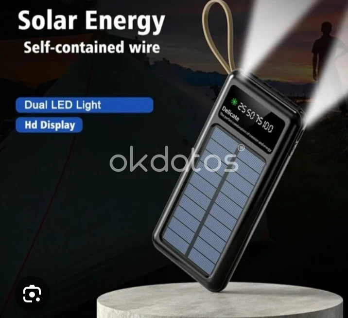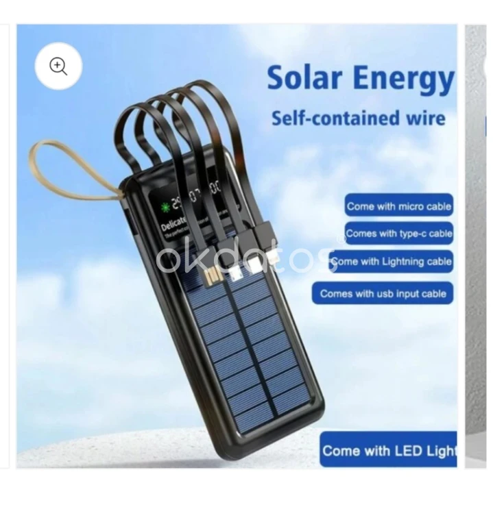 solar power bank, likely a 20000mAh model, featuring a solar panel for charging, built-in cables, and dual LED lights for illumination.