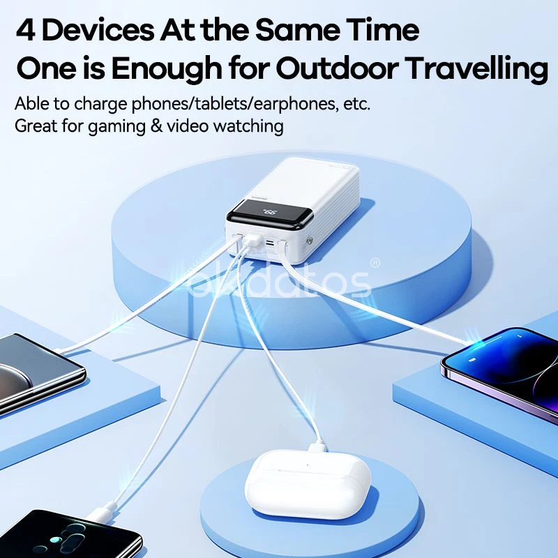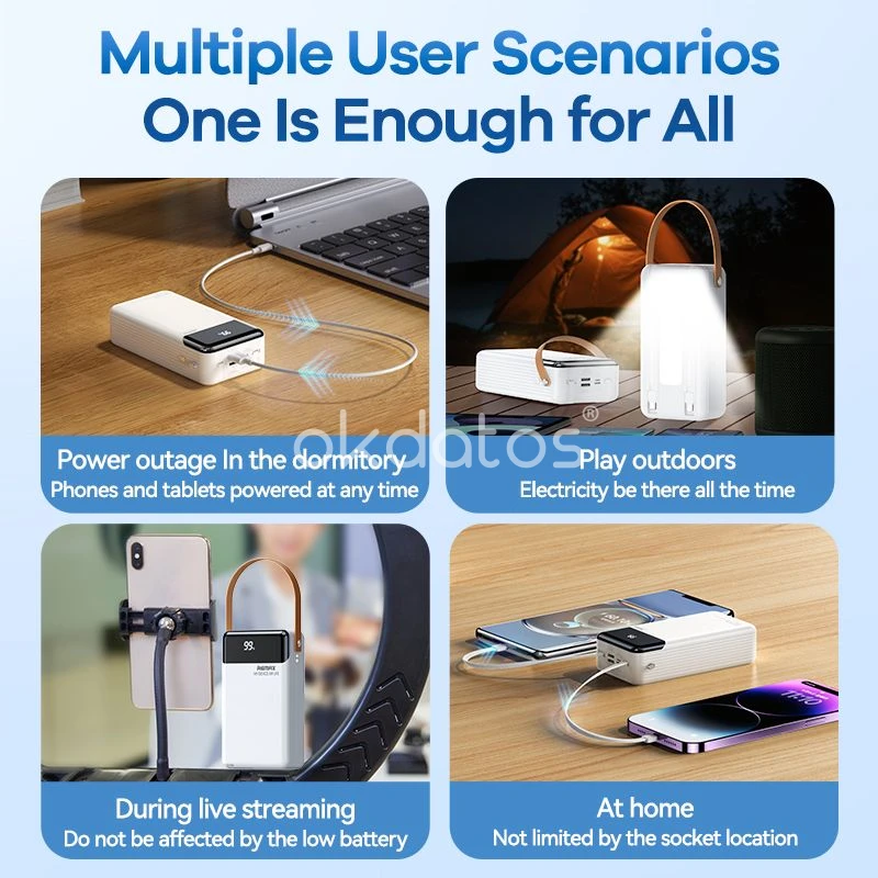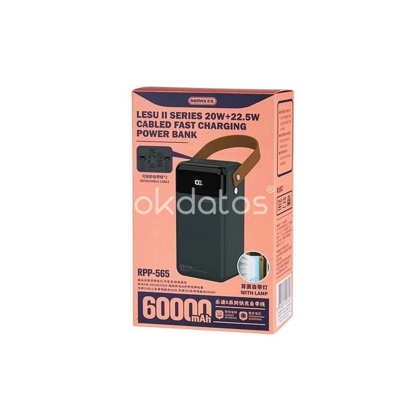 The Remax 22.5W 60000mAh Fast Charging Power Bank is designed for users who need reliable, long-lasting power for multiple devices. With 5 outputs and 4 inputs, it allows you to charge several devices at the same time, making it perfect for travel, camping, and emergency use. Built-in Type-C and iPhone cables eliminate the need to carry extra cords, while a detachable Type Fast Charging 22.5W Output - Delivers up to 22.5W for smartphones, tablets and other devices. Multi-Device Charging - 5 outputs and 4 inputs allow you to charge multiple devices at the same time. Built-in Cables - Integrated Type-C and iPhone (Lightning) cables, plus detachable Type-C cable for convenience. Emergency LED Light - Bright LED torch, perfect for outdoor use, camping, and emergencies. Safe & Durable - ABS+PC V0 fireproof material with UV finish ensures safety and long-lasting performance. Why Choose This Product Ideal for travelers, campers, and outdoor users who need reliable backup power. Eliminates the hassle of carrying extra cables with built-in charging solutions. Supports fast charging for both iPhone and Android devices. Provides emergency lighting whenever you need it. Backed by Remax brand quality, ensuring stable performance and safety. Input Ports: Type-C ×1, iPhone ×1 Output Ports: USB ×2, Built-in Type-C ×1, Built-in iPhone ×1 Total Outputs: 5 devices simultaneously Massive 60000mAh Capacity - Long-lasting power supply, keeps your devices charged during long trips. Fast Charging 22.5W Output - Delivers up to 22.5W for smartphones, tablets and other devices. Multi-Device Charging - 5 outputs and 4 inputs allow you to charge multiple devices at the same time. Emergency LED Light - Bright LED torch, perfect for outdoor use, camping, and emergencies. Why Choose This Product Ideal for travelers, campers, and outdoor users who need reliable backup power. Eliminates the hassle of carrying extra cables with built-in charging solutions. Supports fast charging for both iPhone and Android devices. Provides emergency lighting whenever you need it. Backed by Remax brand quality, ensuring stable performance and safety. Specifications Capacity: 60000mAh (Real capacity approx. 33000mAh at 5V-3A) Input Ports: Type-C ×1, iPhone ×1 Output Ports: USB ×2, Built-in Type-C ×1, Built-in iPhone ×1 Total Outputs: 5 devices simultaneously Input Voltage: Type-C: 5V-2A / 9V-2A / 12V-1.5A (Max 18W) iPhone: 5V-2A / 9V-2A / 12V-1.5A (Max 18W) Output Voltage: USB1: 4.5V-5A / 5V-4.5A / 5V-3A / 9V-2A / 12V-1.5A (22.5W Max) Built-in Type-C: 22.5W Max Built-in iPhone: 20W Max USB2: 5V-2A Total Output: 5V-3A (Max)